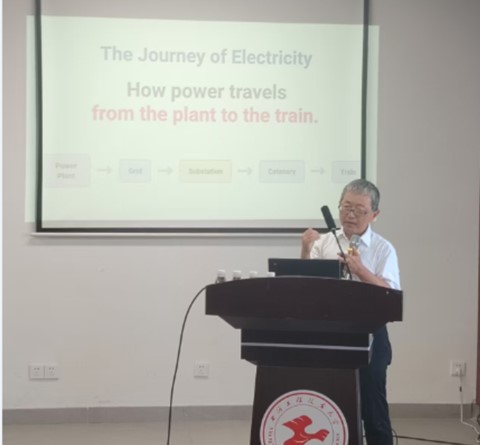 讲座伊始,城市轨道交通学院副院长胡定玉教授隆重介绍了KOSEKI Takafumi教授,并代表学院对其到来表示热烈欢迎。在报告中,KOSEKI Takafumi教授聚焦日本铁路电力系统与节能技术的先进经验,从日本独特的铁路技术背景出发,系统解析了交流与直流供电的基础原理,重点阐述了再生制动技术在提升能效方面的核心作用。通过日本、中国、欧盟技术体系的国际对比,他清晰指出了不同技术路线的特点,并分享了对前沿方向的展望。KOSEKI Takafumi教授学识渊博、语言生动,其深入浅出的讲解令在场师生受益匪浅。