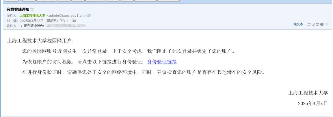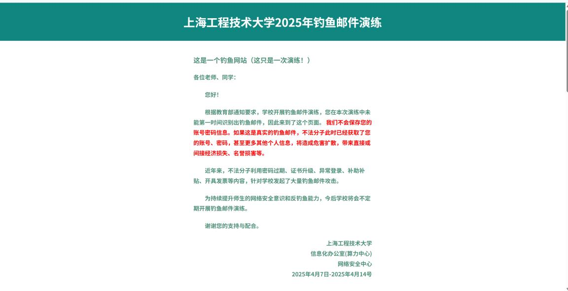 为提升我校师生的基本防范技能,培养对潜在威胁的安全防范意识,帮助师生识别和防范钓鱼邮件攻击,提高对钓鱼邮件的辨别能力,信息化办公室(算力中心)于2025年4月7日~14日期间,组织开展了钓鱼邮件专项演练。以下是本次演练的邮件主题内容及相关宣教页面: