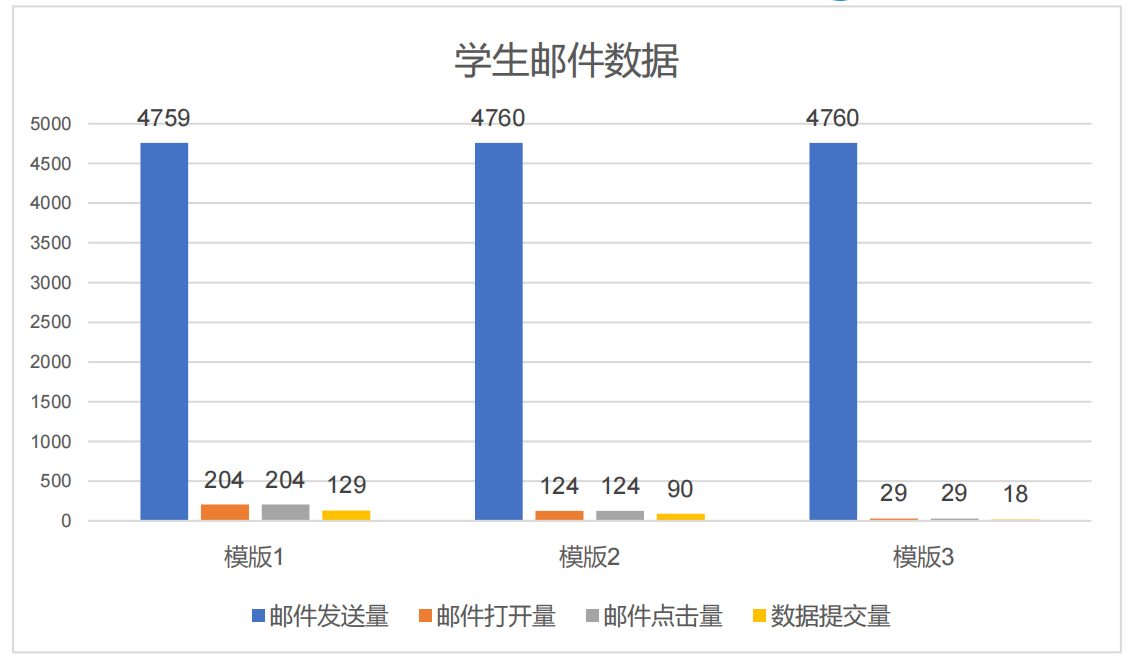 14279个学生邮箱账号(包含本科生和研究生)收到了钓鱼邮件,2.5%的用户(357个)打开了钓鱼邮件,2.5%的用户(357个)点击了钓鱼链接,1.66%的用户(237个)提交了个人账号信息被成功钓鱼。