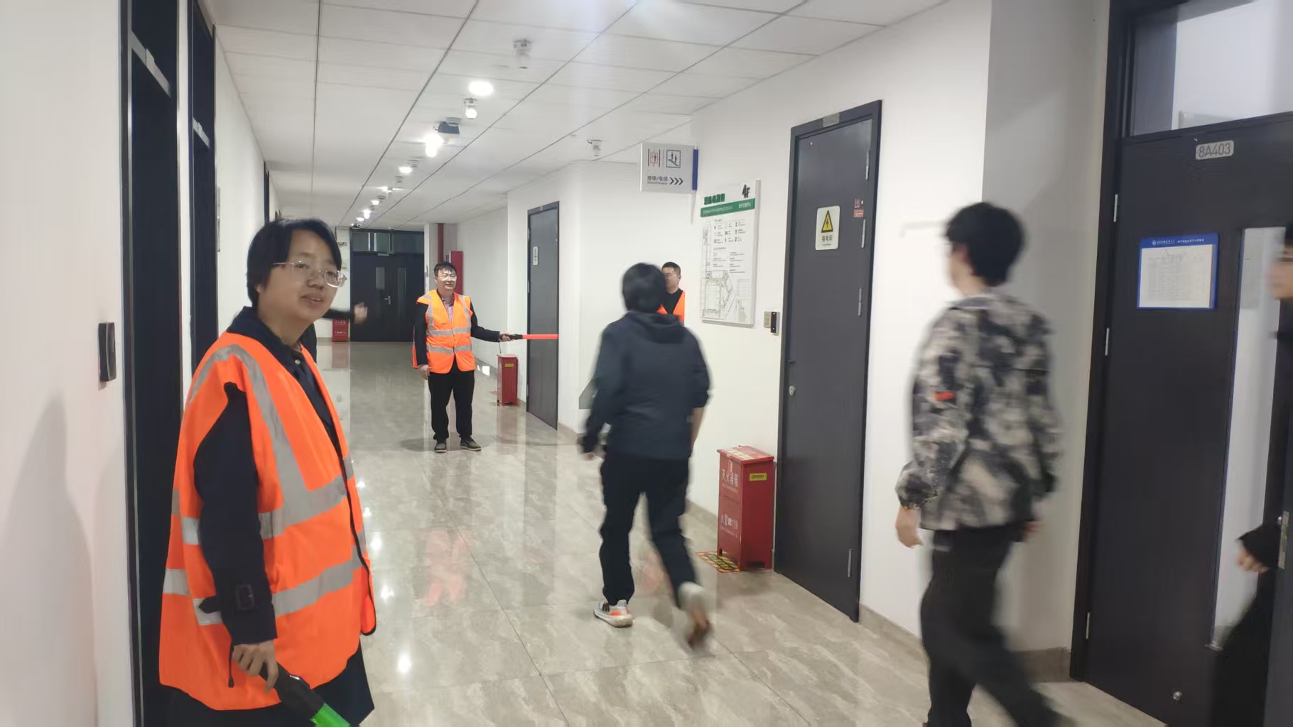 在学院副院长朱琳老师的指挥下,首先保卫处吴挺老师和中心实验宋瑞刚老师耐心地向参与演练的师生们普及防灾减灾知识和技能,然后结合我院实验室的具体情况,开展了实验室突发事件应急预案推演,并制定了疏散逃生演练方案。根据疏散方案,相关人员到达指定疏散楼梯口引导师生顺着逃生线路从消防安全通道分流疏散撤离。最后,在播放紧急疏散警报后,疏散引导组成员立即组织学生疏散,学生有序跑出教室,在各老师的引导下顺利地通过了相对窄小的楼道,最后到达指定位置。