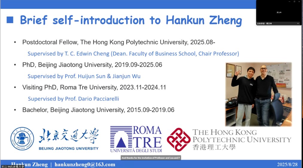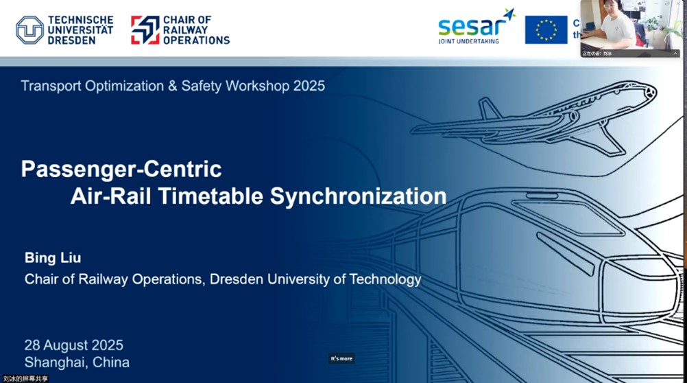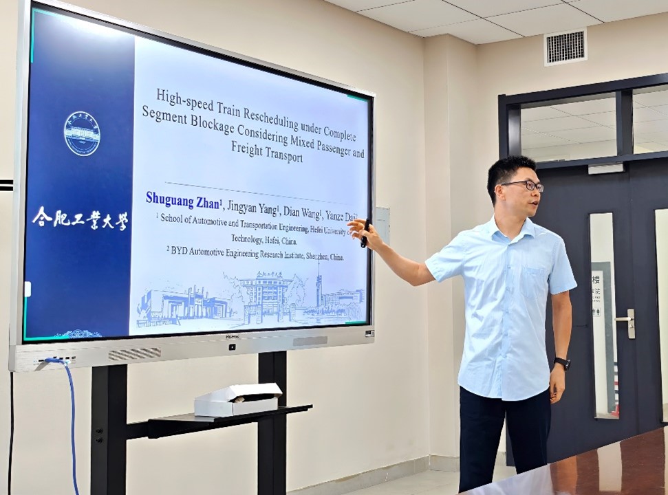 Professor Zhan Shuguang from Hefei University of Technology presented on High-speed Train Rescheduling under Complete Segment Blockage Considering Mixed Passenger and Freight Transport, discussing real-time rescheduling methods for mixed passenger and freight trains under complete segment blockage scenarios. Associate Professor Mo Pengli from Nanjing University of Aeronautics and Astronautics, in his report titled Subsidy Allocation Problem with Bus Frequency Setting Game: A Tri-level Formulation and Exact Algorithm, proposed a tri-level optimization model based on game theory, revealing the impact of subsidy allocation and bus competition on social costs. Associate Professor Li Sijie from our college delivered a report titled Coordinated Optimization of Train Skip-Stopping and Passenger Flow Control in Urban Rail Transit Considering Passenger Travel Behavior, introducing a coordinated method that integrates skip-stop optimization and passenger flow control, with its application effectiveness validated using a reinforcement learning algorithm on Shanghai Metro Line 9. Dr. Liu Bing from Technische Universität Dresden focused on Passenger-Centric Air-Rail Timetable Synchronization, proposing a passenger-centric optimization method for synchronizing air-rail timetables and verifying its effectiveness using a case study from the Spanish air-rail network. Dr. Zheng Hankun from The Hong Kong Polytechnic University discussed Multiperiod Alternative Service Optimization Responding to Joint Disruptions in Multimodal Transit Systems, studying response strategies for joint disruptions in multimodal transit systems and proposing a multiperiod alternative service optimization model, which was validated using a case study from Beijing.