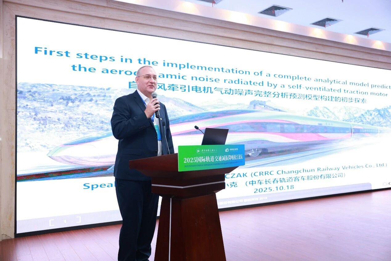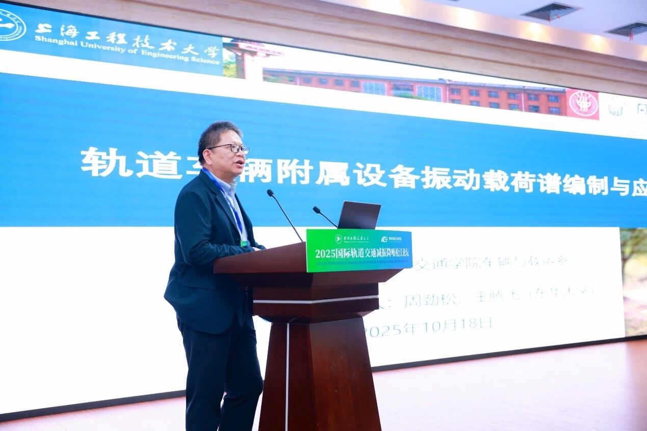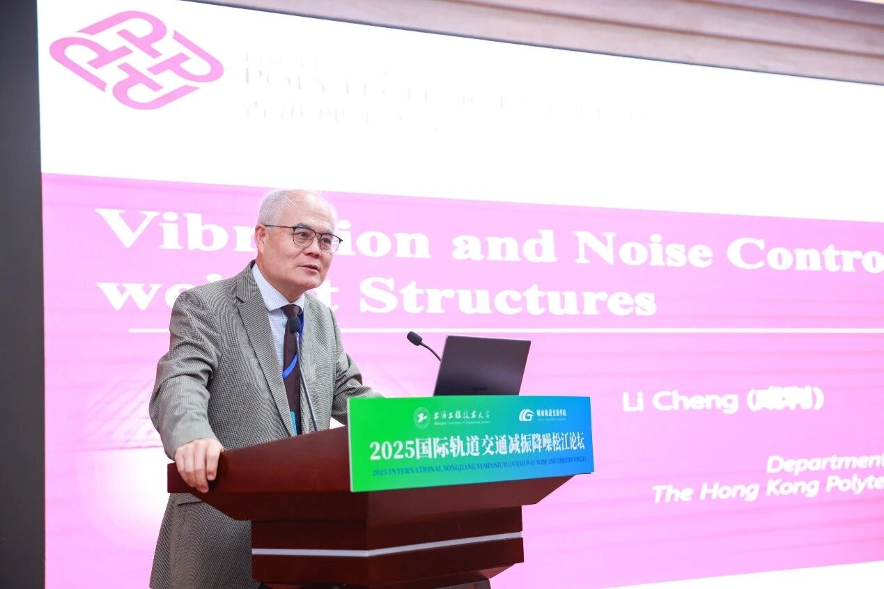 On October 18-19, 2025 International Songjiang Symposium on Railway Noise and Vibration Control was successfully held at Shanghai University of Engineering Science. The symposium was hosted by Shanghai University of Engineering Science and jointly organized by the University's International Office, School of Urban Railway Transportation, and Shanghai Rail Transit Vibration and Noise Control Technology Engineering Research Centre. Nearly 200 experts and scholars from enterprises, universities, and research institutions in China, the United Kingdom, France, Canada, and other countries and regions attended the Symposium. Participants included Professor Cheng Li of the Faculty of Engineering at The Hong Kong Polytechnic University, Fellow of the Canadian Academy of Science and Canadian Academy of Engineering; Senior Engineer Maliczak Christophe Olivier, Technical Expert from CRRC Changchun Railway Vehicles Co., Ltd.; Professor Sheng Xiaozhen from Shanghai University of Engineering Science, a recipient of national-level talent recognition; Wang Senrong, Executive Deputy General Manager of Zhejiang Tiantie Industry Co., Ltd; Zhang Hewei, General Manager of ProBiot Technology Group Co., Ltd; Ni Bing, Chief Planner of City Line and General Manager of Maiton Media; Professor Zhou Jinsong and Professor Yang Xinwen from Tongji University; Professor Feng Qingsong from East China Jiaotong University; Senior Engineer Xing Hailing from the Technology Center of Shentong Metro Group Co., Ltd.; Wan Huilin, Party Secretary of School of Urban Railway Transportation; as well as faculty and student representatives from the university. The opening ceremony was presided over by Secretary Wan Huilin.